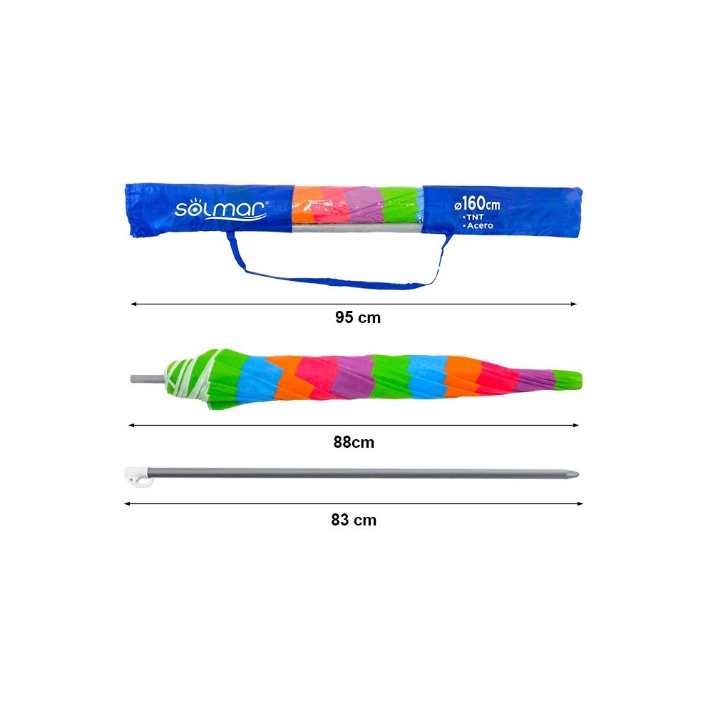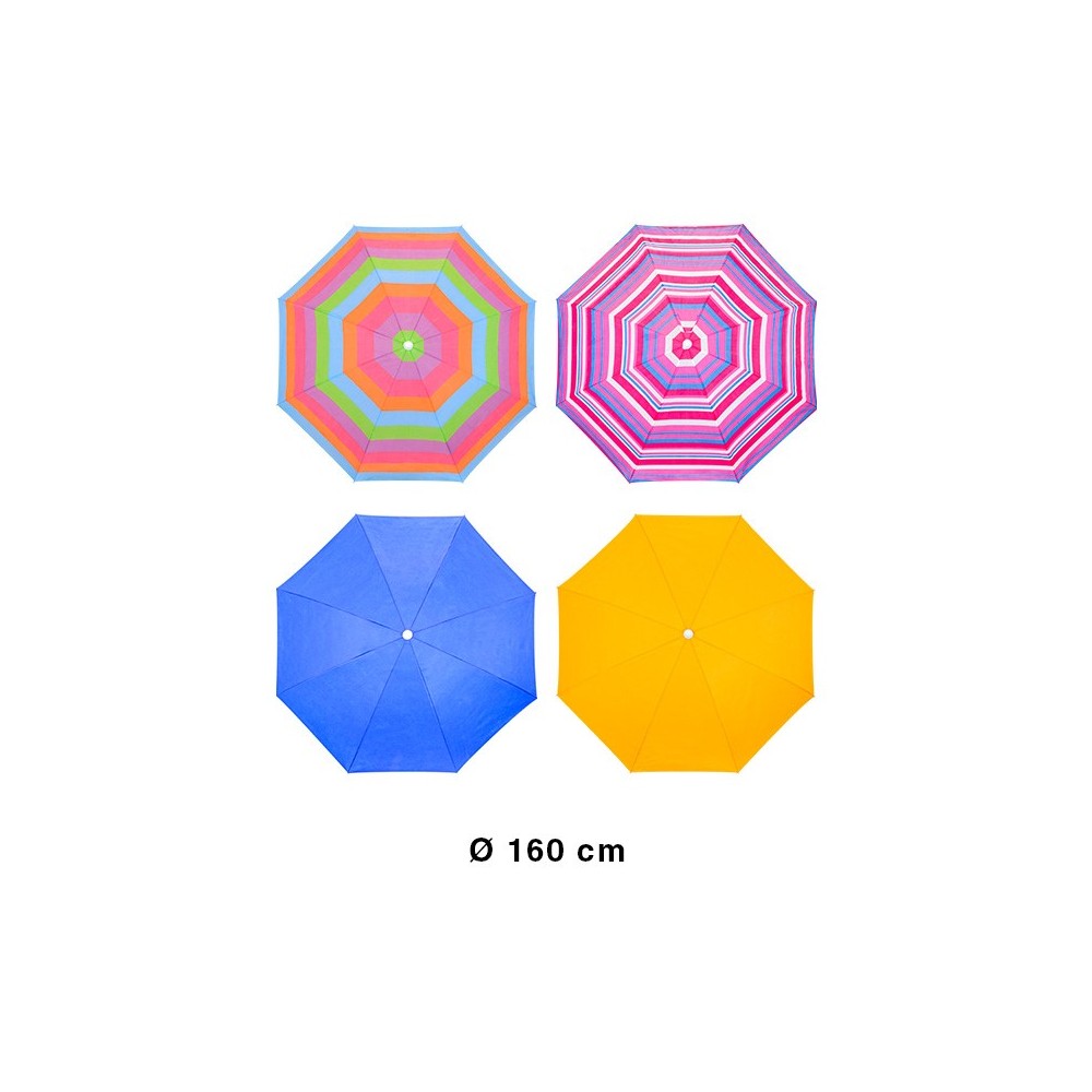 Disfruta del verano con la máxima comodidad. Sombrilla de playa de 160 cm de diámetro con sistema de inclinación ajustable para seguir la sombra todo el día. Fabricada con 8 varillas de acero y tejido TNT de alta durabilidad. Ligera, fácil de transportar y disponible en vibrantes diseños lisos y a rayas. ¡Tu compañera ideal para la arena!